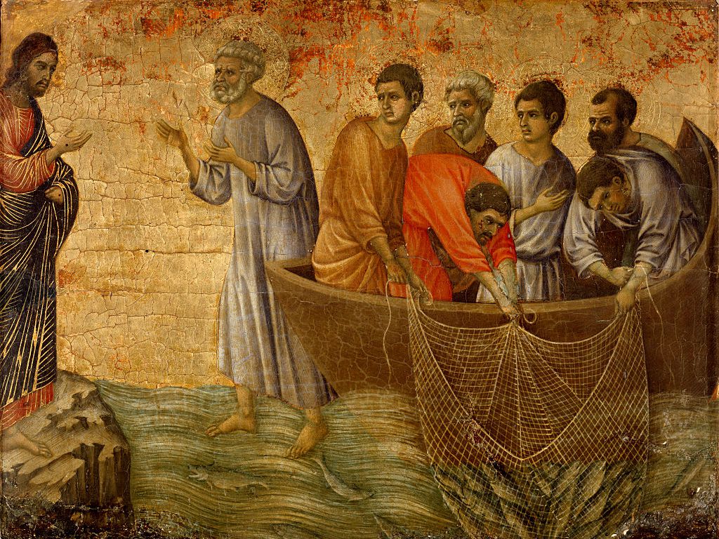 Just after daybreak, Jesus stood on the beach; but the disciples did not know that it was Jesus. Jesus said to them, ‘Children, you have no fish, have you?’ They answered him, ‘No.’ He said to them, ‘Cast the net to the right side of the boat, and you will find some.’ So they cast it, and now they were not able to haul it in because there were so many fish. That disciple whom Jesus loved said to Peter, ‘It is the Lord!’ When Simon Peter heard that it was the Lord, he put on some clothes, for he was naked, and jumped into the lake. But the other disciples came in the boat, dragging the net full of fish, for they were not far from the land, only about a hundred yards off.