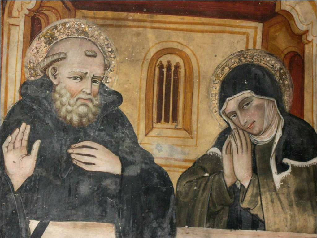 According to the Dialogues of Gregory the Great, Scholastica was born c. 480 in Nursia, Umbria, of wealthy parents (Anicius Eupropius and his wife Claudia Abondantia Reguardati). While Gregory states that Scholastica was Benedict’s sister, a later tradition says she was his twin (whether this is meant biologically or spiritually, or both is unclear). Gregory also says she was dedicated to God from a young age. She and her brother Benedict were brought up together until the time he left to pursue studies in Rome. Benedictine tradition holds that Scholastica established a hermitage about five miles from Monte Cassino and that this was the first convent of Benedictine nuns. However, it is possible that Scholastica lived in a hermitage with one or two other consecrated virgins in a cluster of houses at the base of Mount Cassino where there is an ancient church under her patronage Monastero di Santa Scolastica. WIKIPEDIA