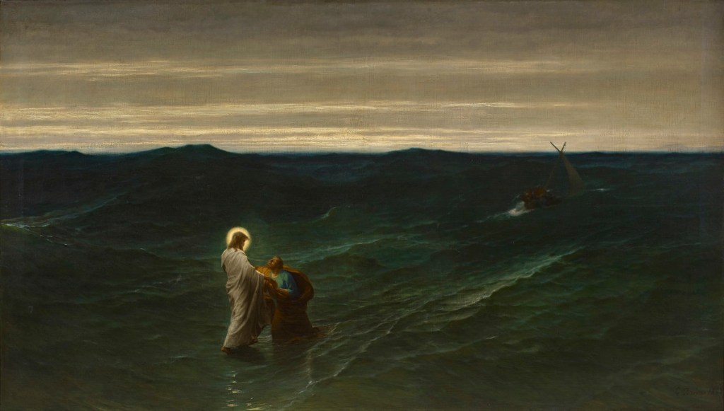 Just then Jesus spoke to them, “Be encouraged! It’s me. Don’t be afraid.” Peter replied, “Lord, if it’s you, order me to come to you on the water.” And Jesus said, “Come.” Then Peter got out of the boat and was walking on the water toward Jesus. But when Peter saw the strong wind, he became frightened. As he began to sink, he shouted, “Lord, rescue me!” Jesus immediately reached out and grabbed him, saying, “You man of weak faith! Why did you begin to have doubts?” When they got into the boat, the wind settled down. Then those in the boat worshipped Jesus and said, “You must be God’s Son!”