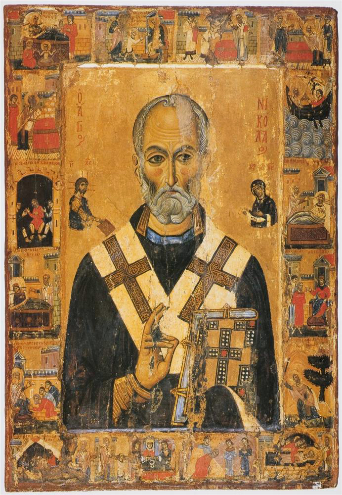 Very little is known about the life of Nicholas, except that he suffered torture and imprisonment during the persecution under the Emperor Diocletian. It is possible that he was one of the bishops attending the First Ecumenical Council of Nicaea in 325. He was honored as a saint in Constantinople in the sixth century by the Emperor Justinian. His veneration became immensely popular in the West after the supposed removal of his body to Bari, Italy, in the late eleventh century. In England almost 400 churches were dedicated to him. Nicholas is famed as the traditional patron of seafarers and sailors, and, more especially, of children. As a bearer of gifts to children, his name was brought to America by the Dutch colonists in New York, from whom he is popularly known as Santa Claus. HWHM